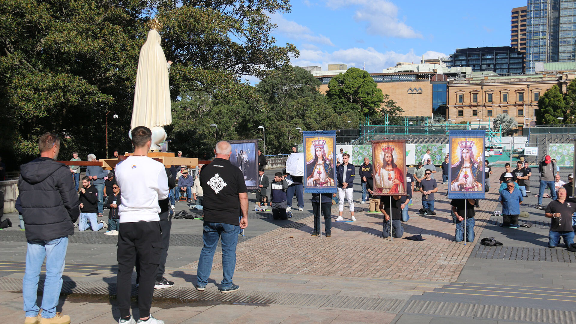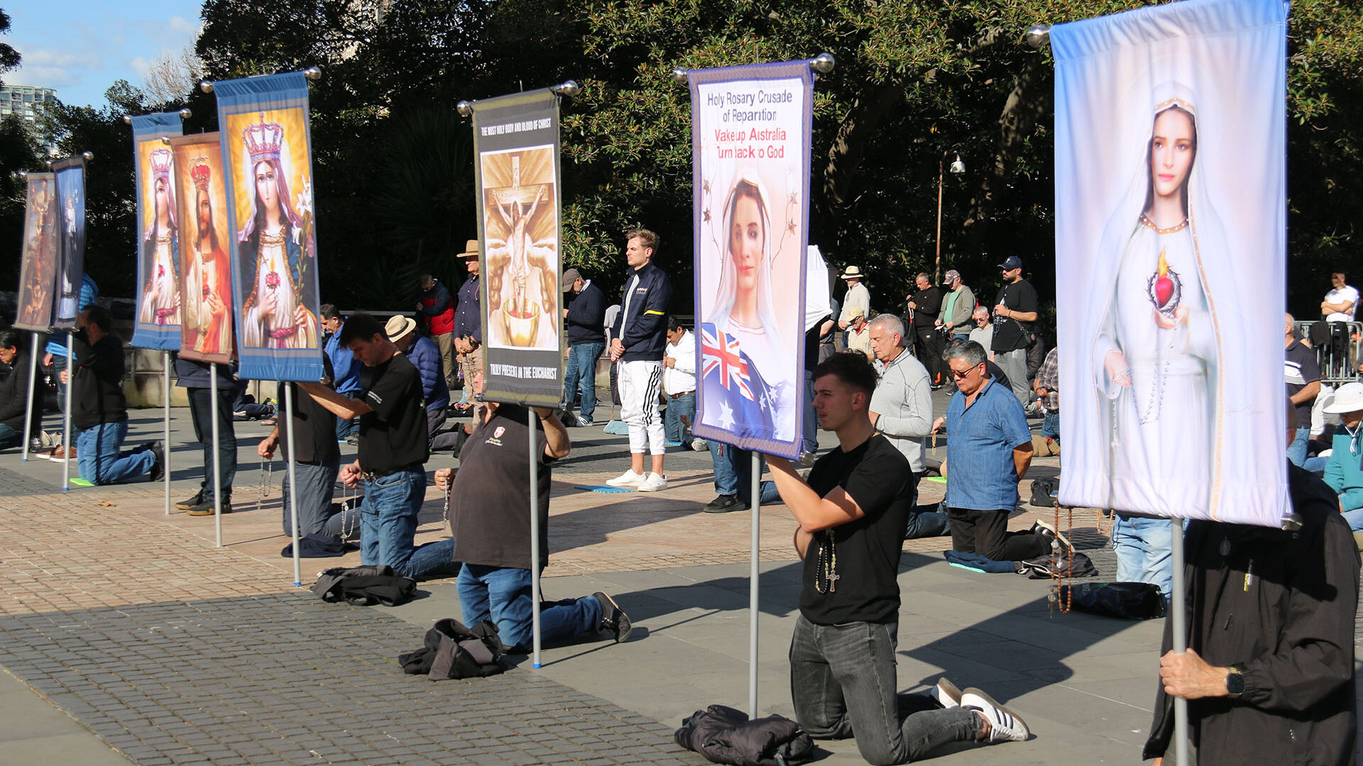 The very first Men’s Rosary Crusade took place on a sweltering Saturday, December 18, 2021, in the forecourt of St. Mary’s Cathedral in Sydney. Around 30 men—young and old, from various cultural backgrounds—gathered in humble obedience to the promptings of the Holy Spirit. Kneeling in battle formation with rosaries in hand, they offered public prayer in reparation and petition, drawing inspiration from the brave witness of Catholic laymen overseas.